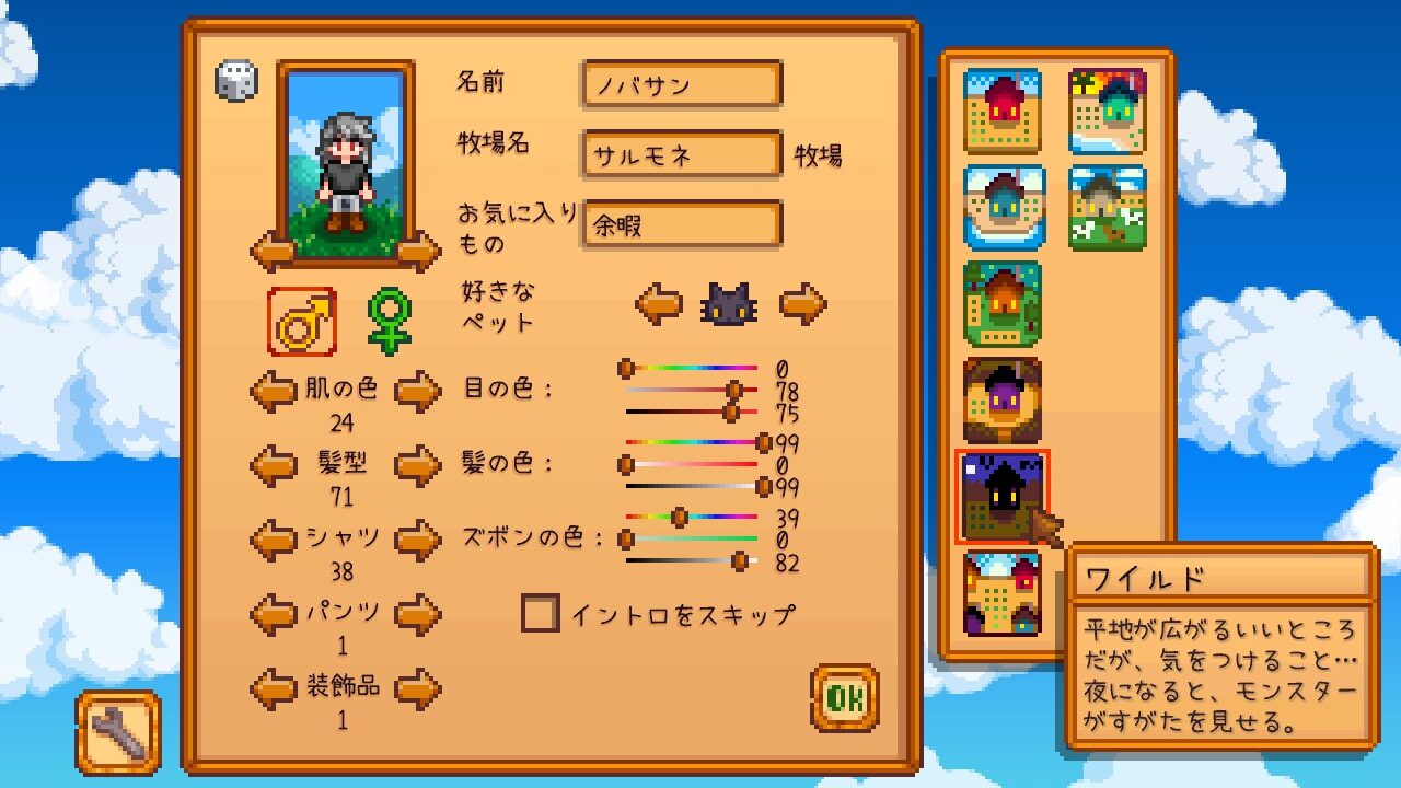 主人公の設定。キャラクリができるんだけど、色合い・造形共にかなり現実的なものしかできなくて、よっぽど振り切らないとモブっぽくなりそうだなと思ったので白髪赤目の厨二ビジュアル男に設定。デフォで主人公の性別を選べるゲームの場合、少なくとも一周目は絶対に男主人公にしちゃいますね。