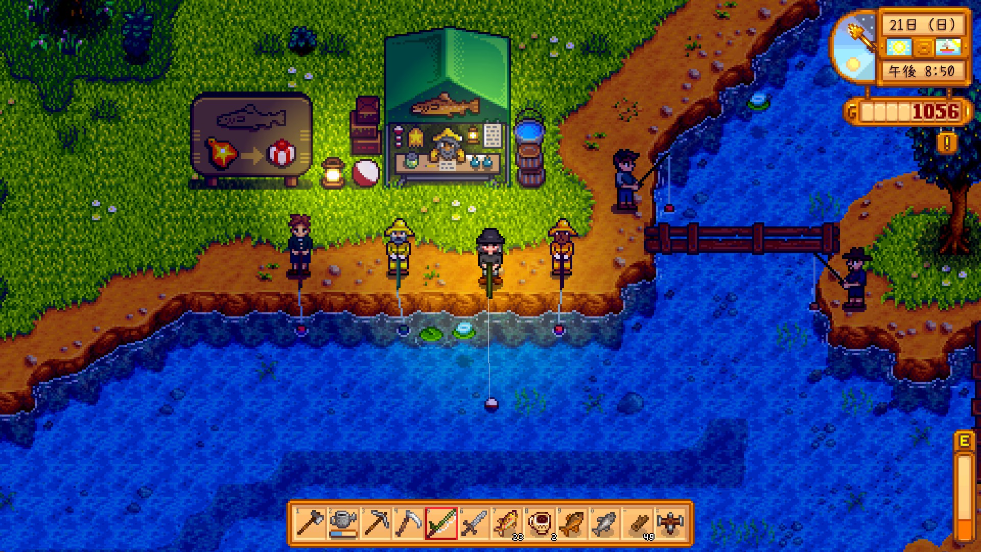 固定のイベントだとマス釣り大会が一番面白かった、というか現状唯一ゲーム性があったといえる。9個ぐらい金色タグを引いて、なかなか豪華な賞品を貰いました。来年もあるなら絶対参加するぞ!