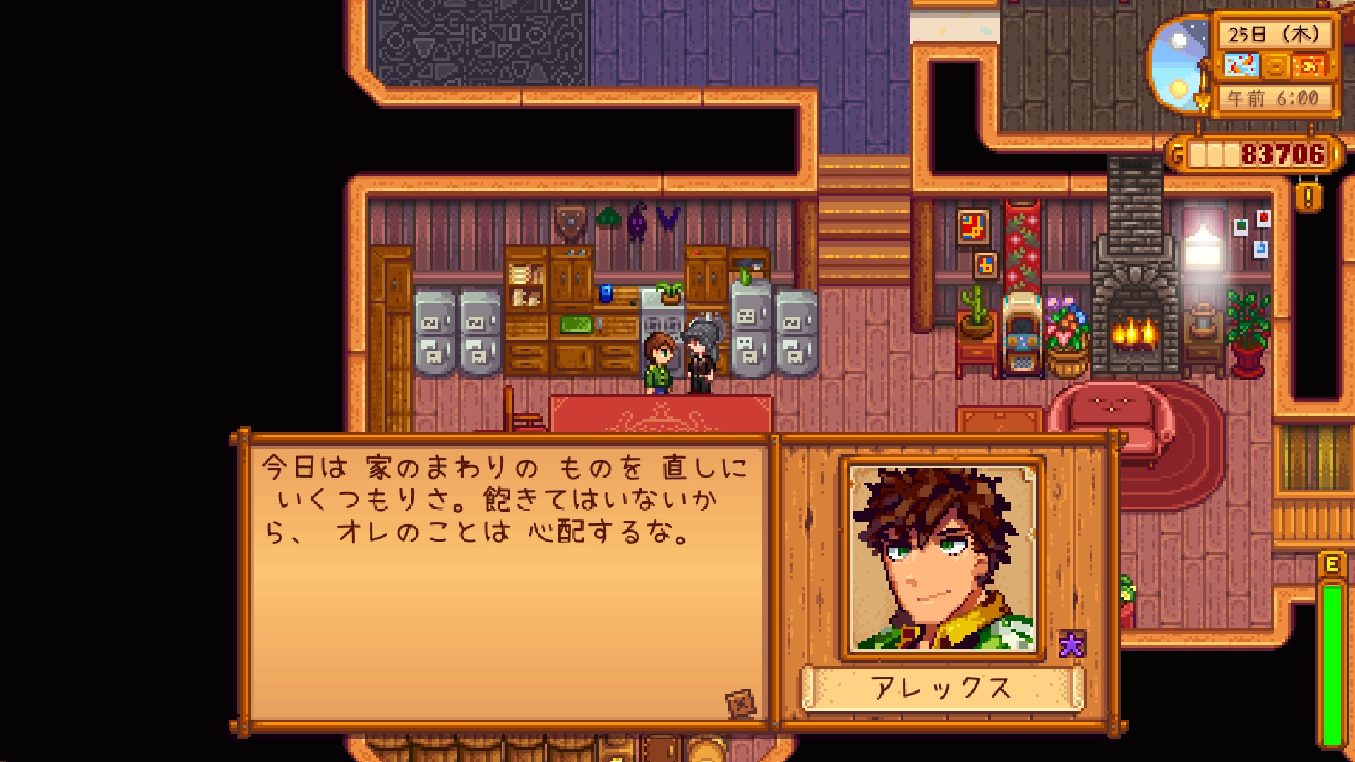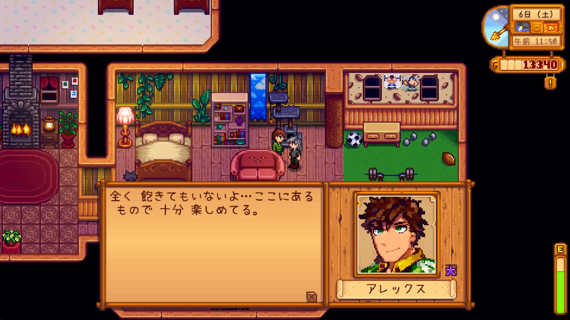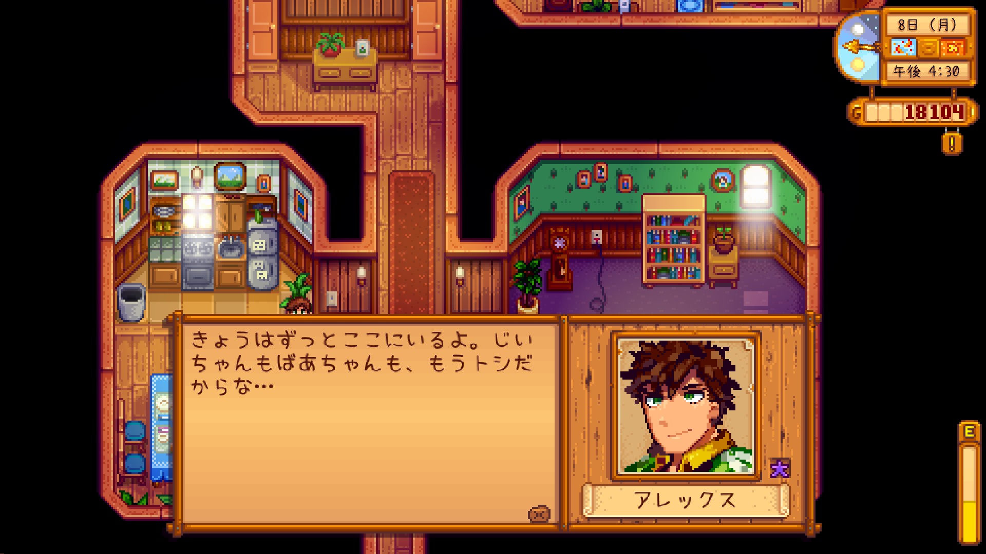 朝起きたらアレックスくんがいねえ!いよいよ見限られたか!?と思ったら祖父母の家に帰省してるだけでした。毎週月曜日はペリカンタウンに戻ってじいちゃんばあちゃんと会うようです。そういうところ…好きだぜ!牧場の家に籠ってるよりは遥かにいいと思うし。
