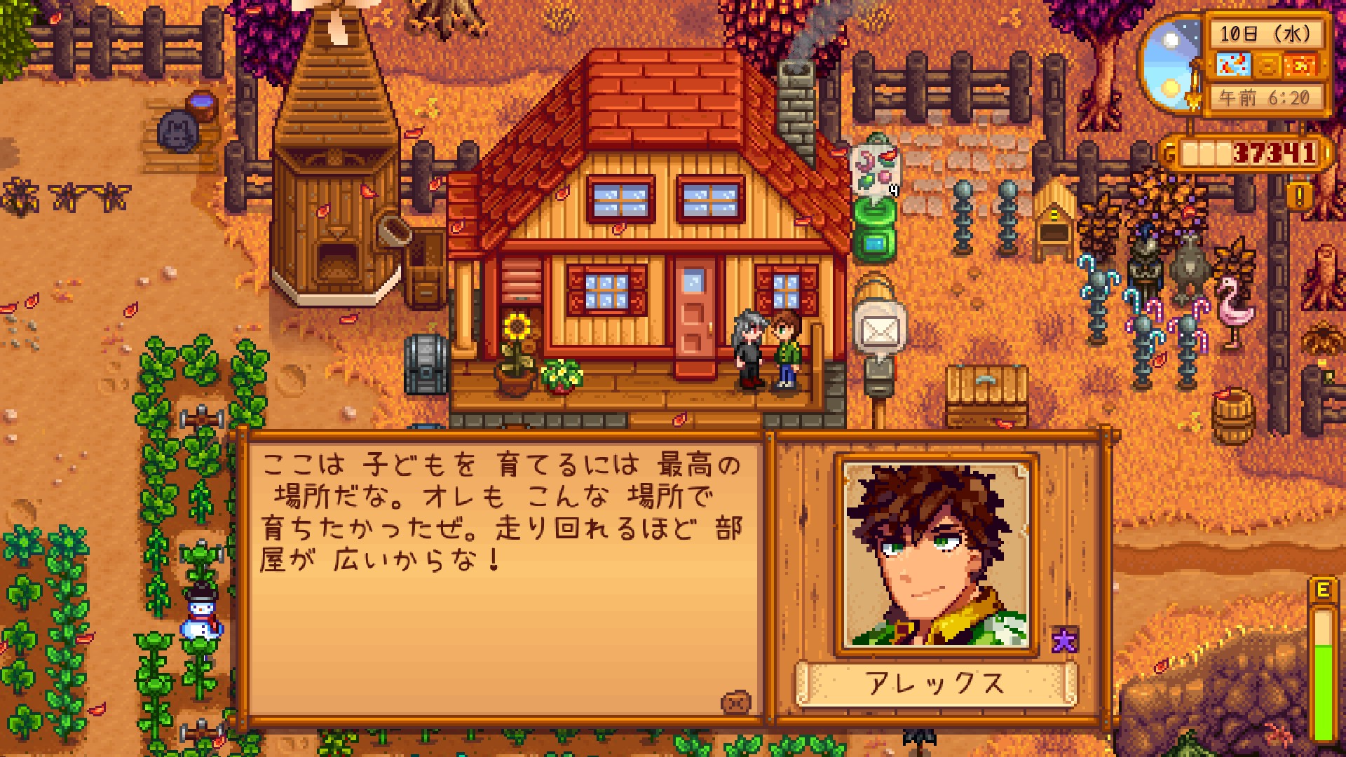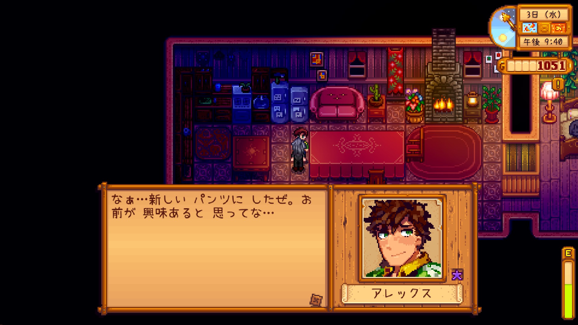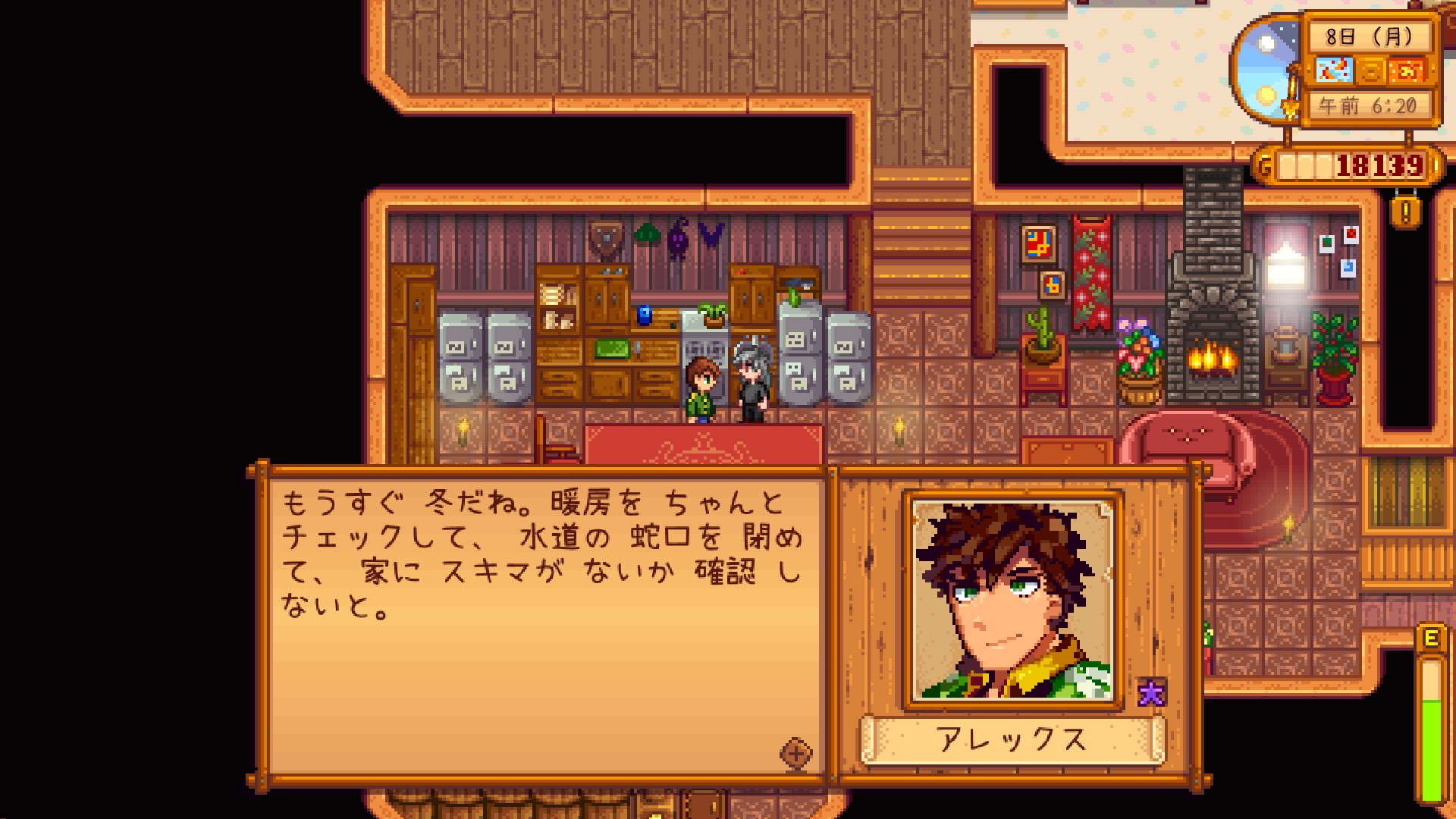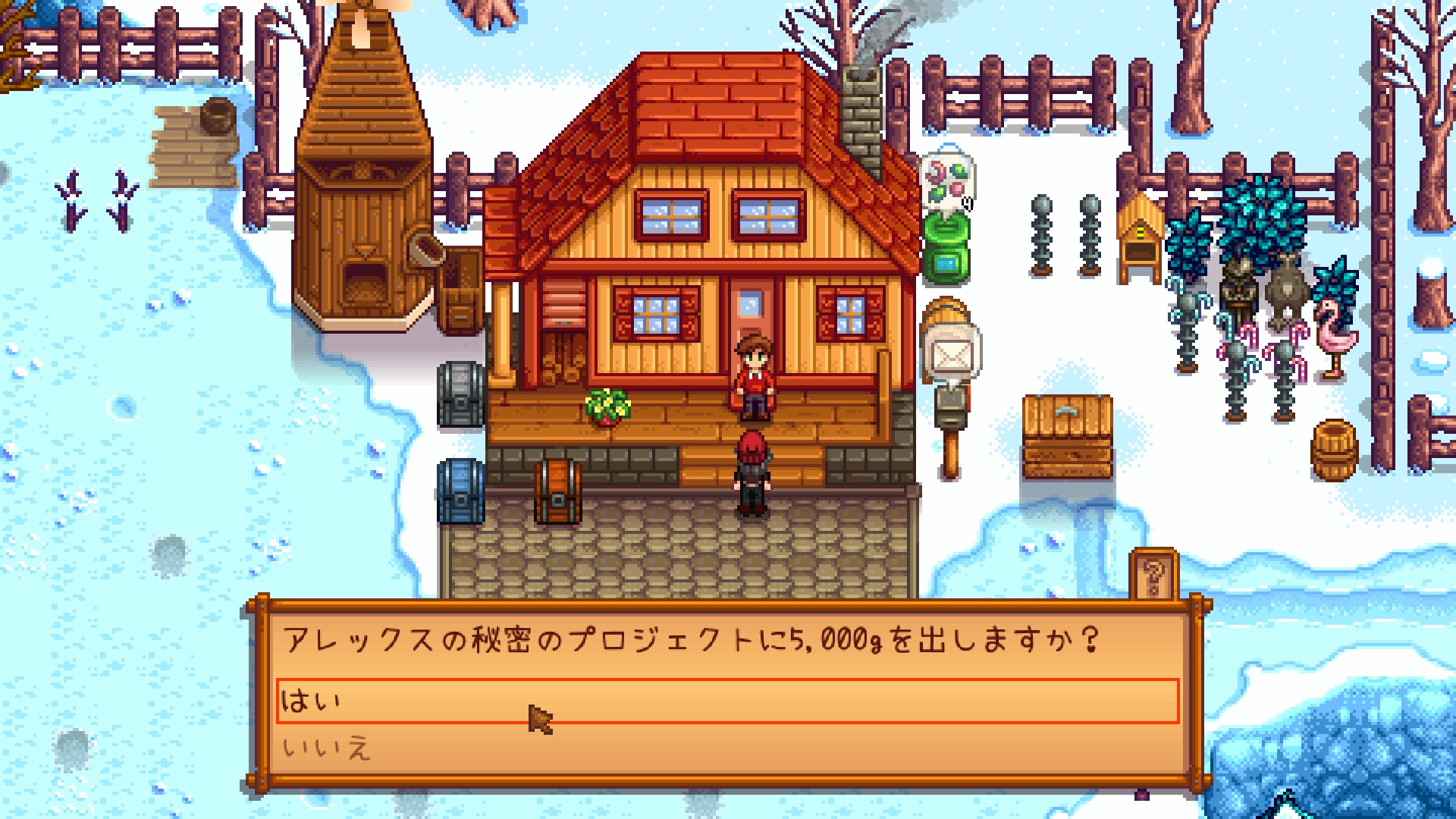 朝起きたらアレックスくんがいねえ!いよいよ見限られたか!?と思ったら祖父母の家に帰省してるだけでした。毎週月曜日はペリカンタウンに戻ってじいちゃんばあちゃんと会うようです。そういうところ…好きだぜ!牧場の家に籠ってるよりは遥かにいいと思うし。