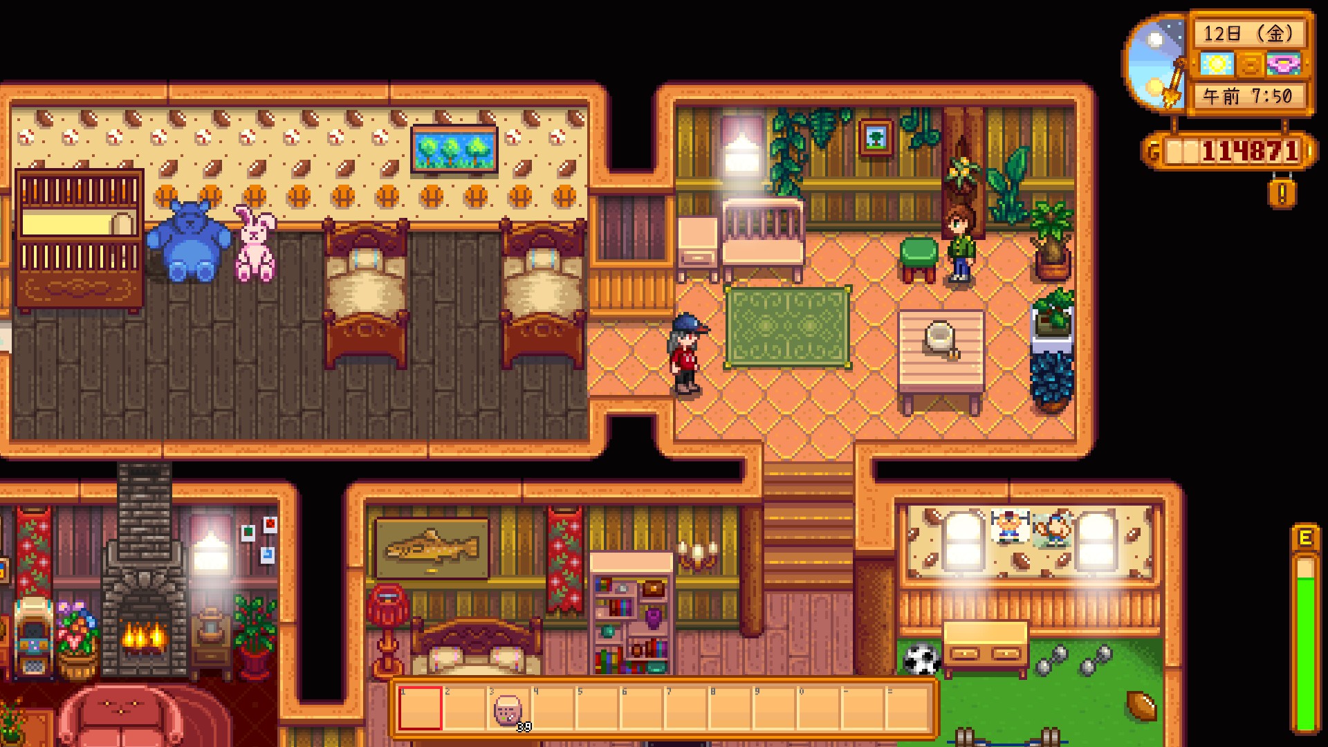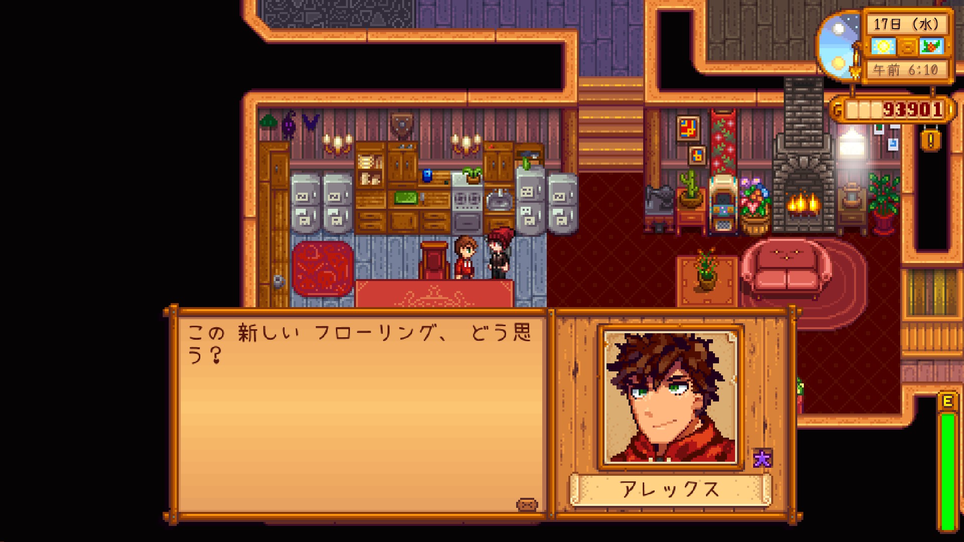 大部屋は赤一色(アカイーソー)にしてたんですが、いつの間にかアレックスくんが青い床に張り替えてました。好きにしたまえ。この好き放題な家の中で(トレーニング部屋を除いて)唯一彼の意思が発揮されている部分だと思うともう二度と張り替えられませんね。