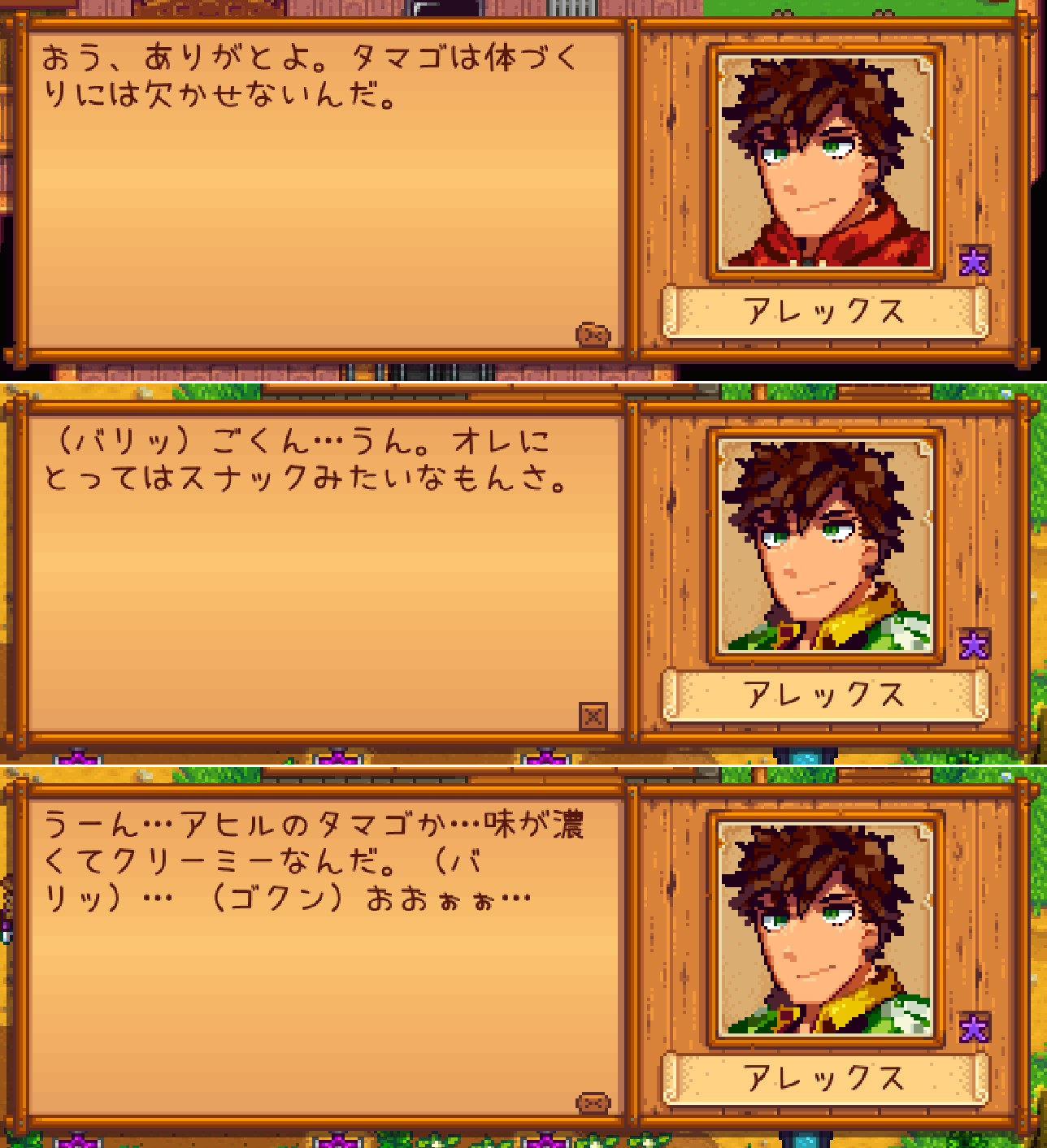 上から普通のタマゴ、大きい(星付き?)タマゴ、アヒルのタマゴをあげた時の台詞。