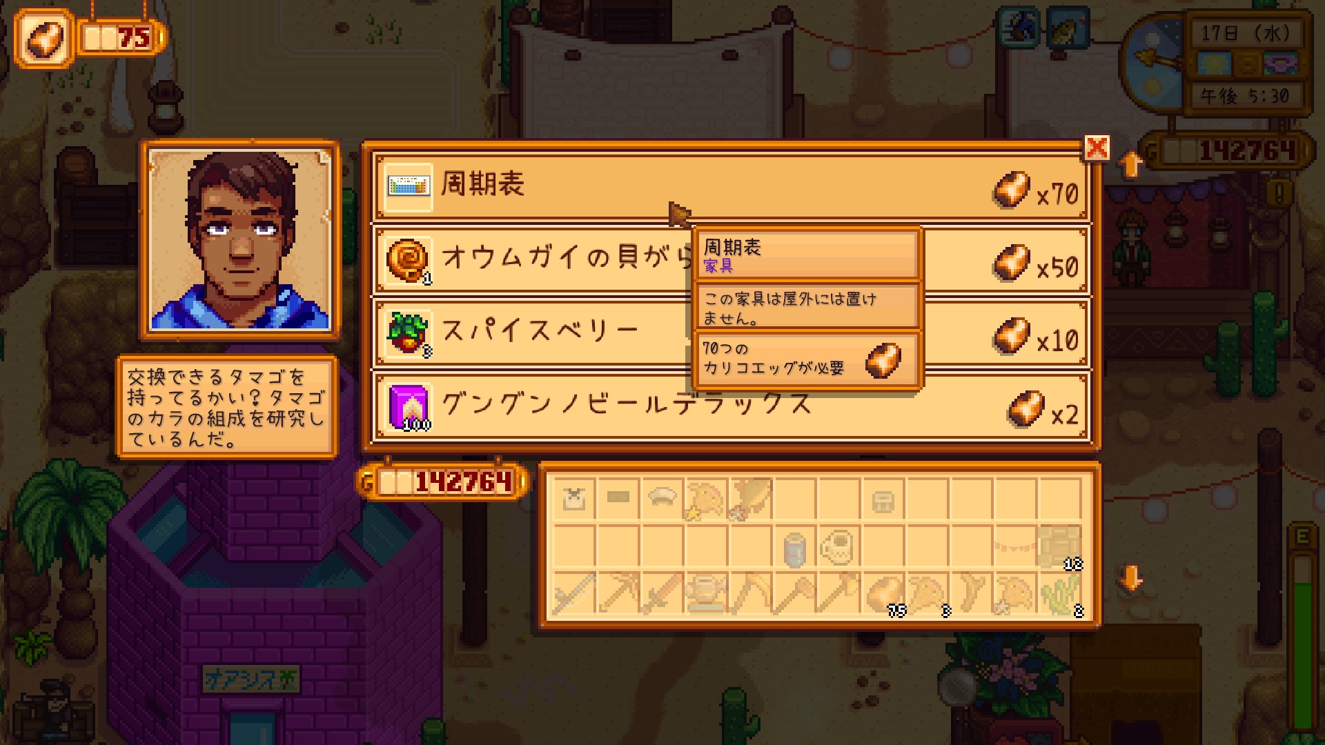 周期表が欲しいのにカリコエッグが足りなかったため、釣りとレースで必死に稼いで何とか購入。ペラ紙一枚にグングンノビールデラックス35個分の価値があるものだろうか?ディメトリウスの市場破壊を許すな