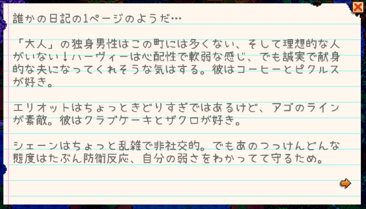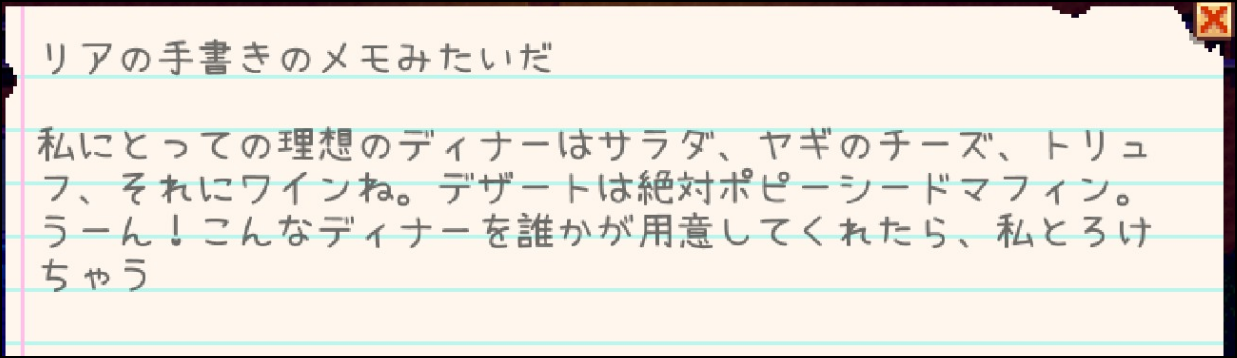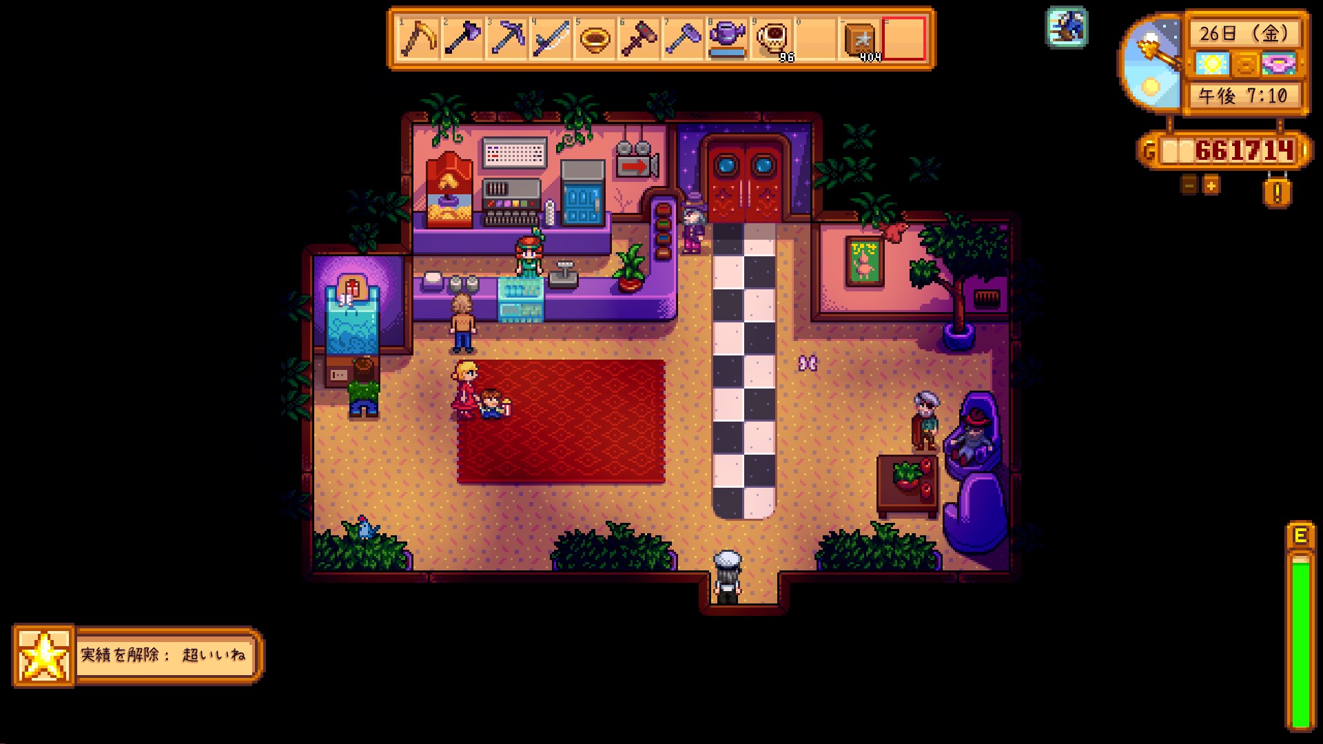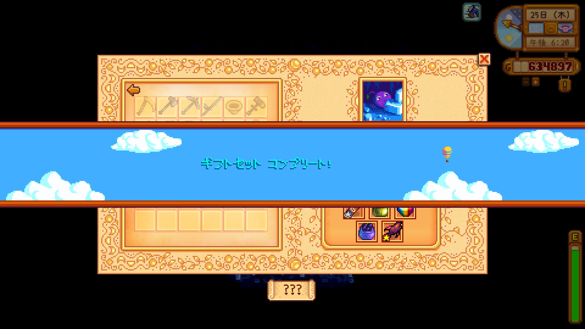 閉店したJojaマートの跡地にあったバンドルを埋める。最初に見た時は「こんなん無理だろ…」と思ったもんです、懐かしい。地下室で作ったワイン、トカゲが産んだ卵で作った恐竜マヨネーズ、ジンジャー島の洞窟で拾ったレインボーシェル、行商人から買ったキャビア、魔女の家の前で釣った闇サーモンを奉納。
