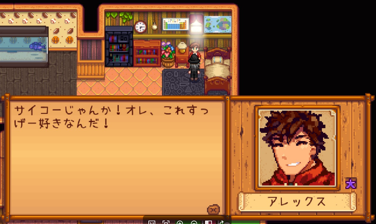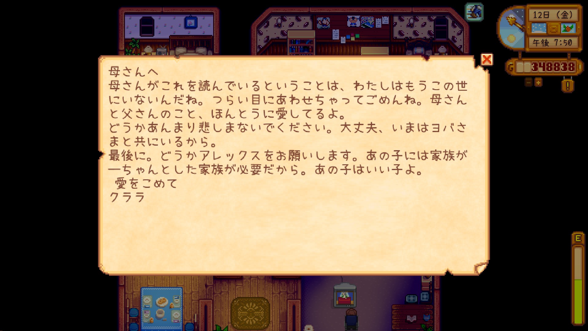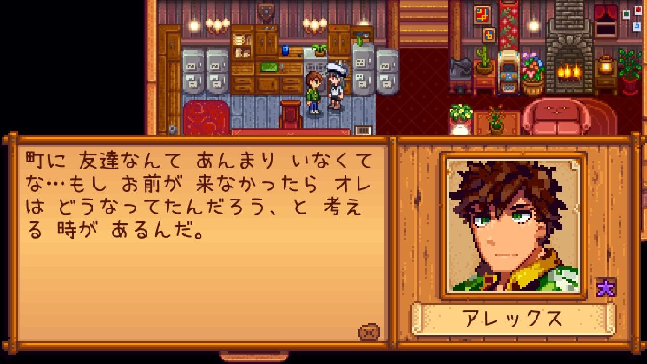 実際牧場主(汎用的な意味)が来なかったら、ハート0時点のヘイリーか祖父母としか関わりがなく、学業/仕事もなく宙ぶらりん状態で、逃避的に夢を見てばかりの状態だったと思うとだいぶ辛いな。とはいえペリカンタウンを出ちゃえばどうにでもなるとは思うけど。いい奴なんだからさ…
