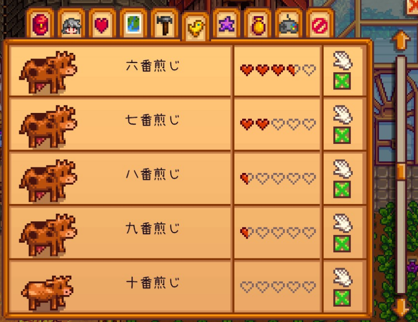 牛を買ってきて「六番煎じ」という名前にしたら何故かそいつの子孫ばかりが繁栄していき、生まれるごとに名前の数字を増やしていったら配列みたいになってしまった。でもって他の血統の牛からは全然生まれない謎。全員「妊娠を許可」してあるんですけどね。