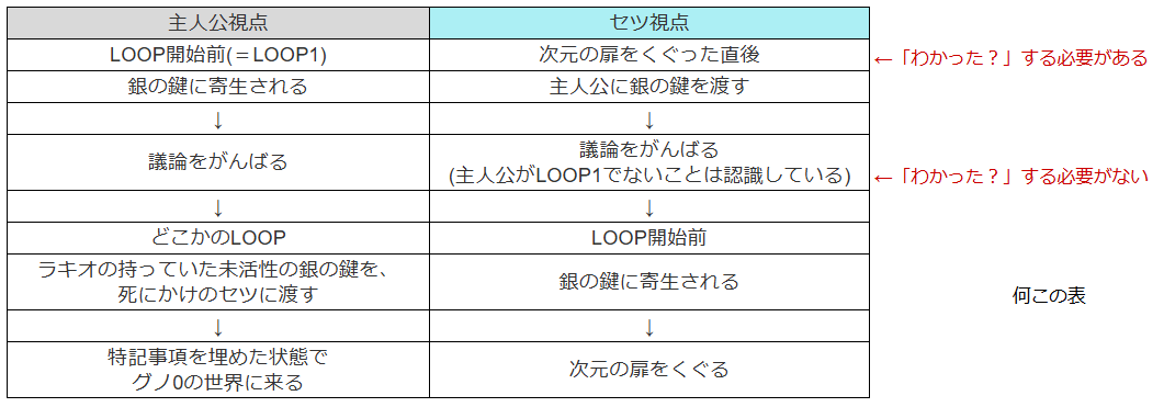 セツ視点では治療ポッド入りの主人公と一緒に次元の扉をくぐった後が、その主人公のLOOP1であることが確定しているわけだから、セツが何周目だろうが、その時以外の主人公はLOOP2以降(=促成学習済み)だってわかるじゃないですか。ならわかったかどうか訊く必要は無いよね。