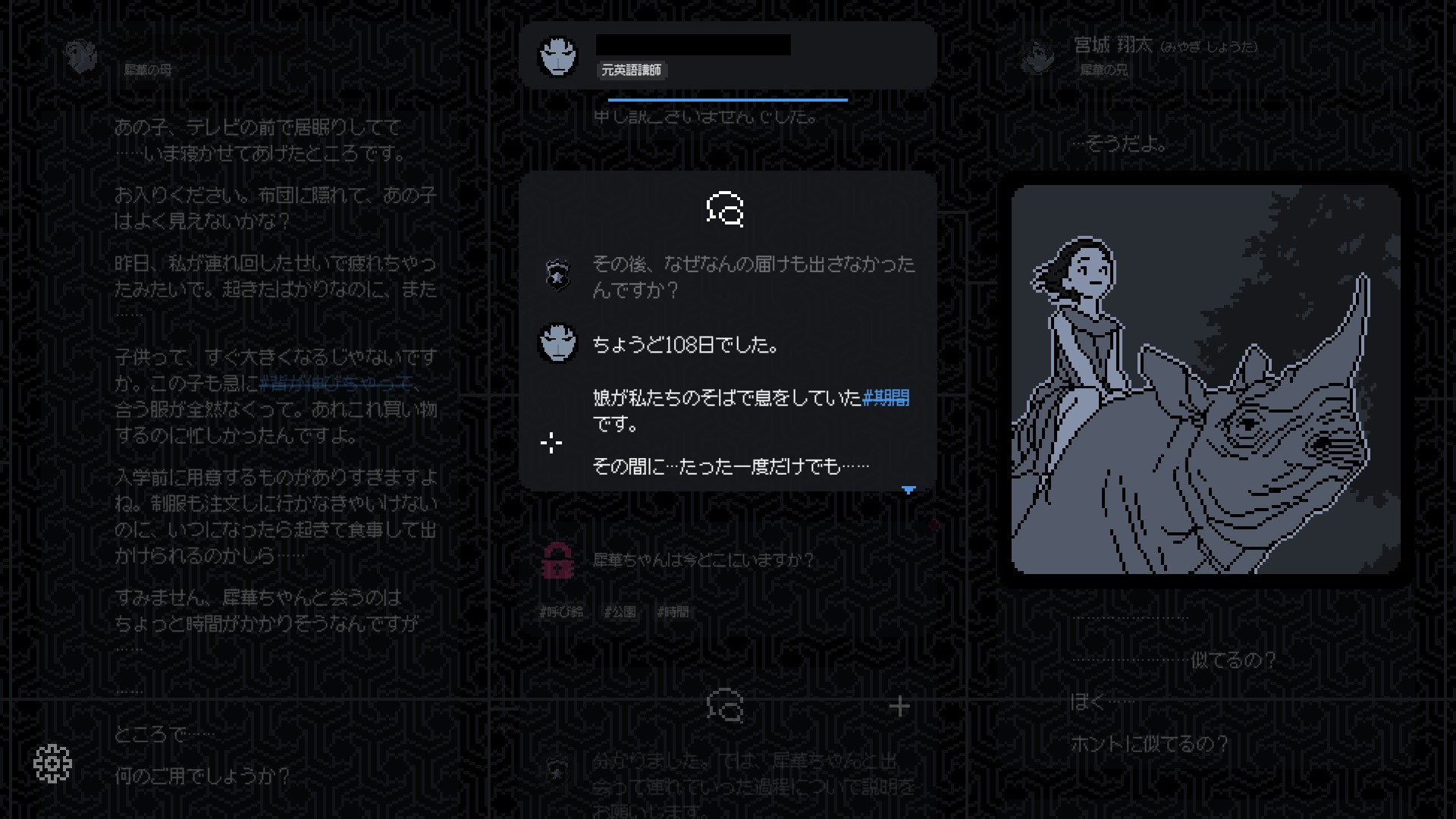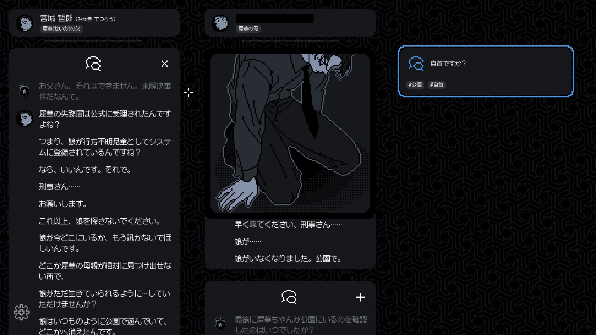 もうネタバレとかどうでもいいゲームなんで言っちゃうと、子供を亡くして精神を病んだ女性が、自分の子供と同名の子供が誘拐された事件を見て、「あの子は生きてるんだ!」ってはしゃぎ始めたから、みんなで(本当は子供が返還されて解決したけど)その事件は未解決で、その子供はどこかで生きてるってことにしてウソついてあげようね、っていう集団ウソつきを始めたせいで、その誘拐事件がいつまでも未解決なんですけど?っていう話。