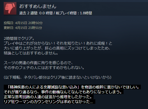 普段はわざわざ👎レビューなんて書かないんですが、クリア後あまりの質の低さにブチ切れて書いてしまった…。それぐらい種明かしの内容にはガッカリしたし、「圧倒的に好評」の文字列に騙される被害者がこれ以上増えないでほしいと思いました。キレすぎだろ。でもそうなっちゃうぐらいクソみてェな出来のお話だったと思うよ…。