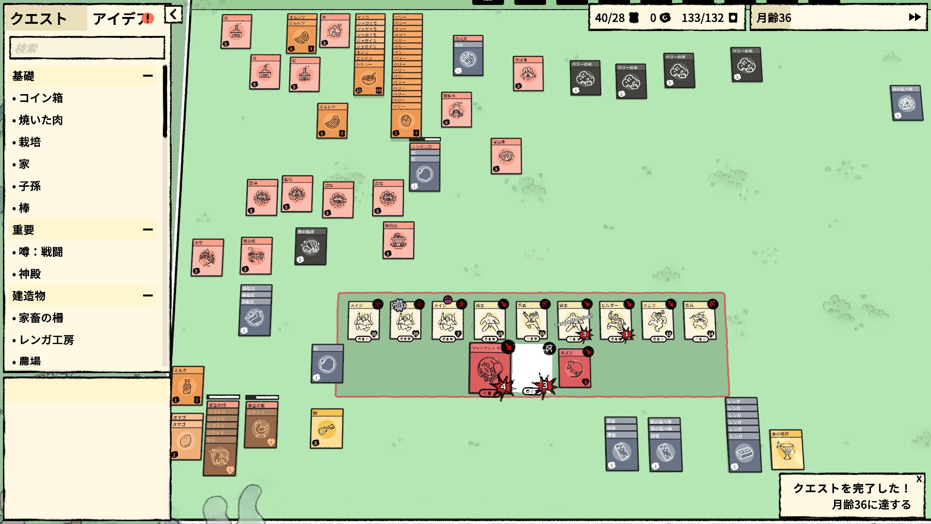盤上に素材や村人のカードを広げてアイテムや施設を錬成し、どんどん村を発展させていくゲーム。