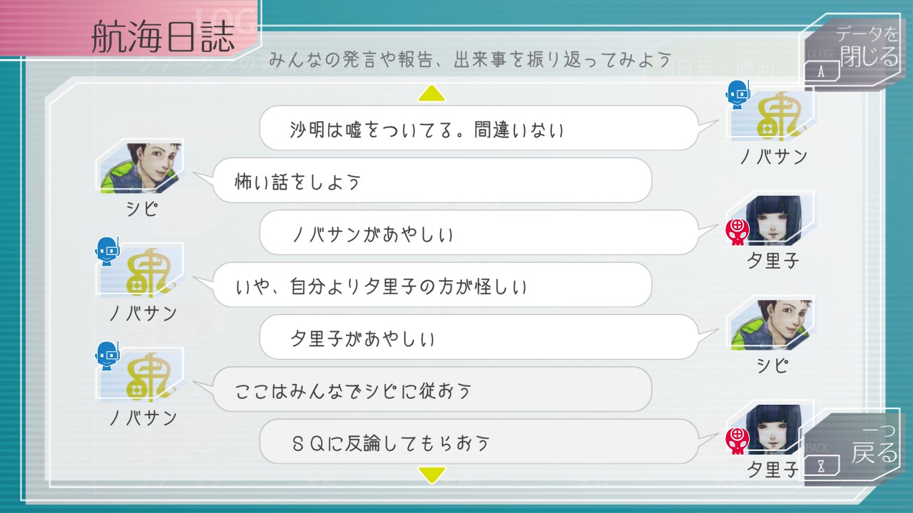 このゲームが面白いのは、登場人物達は常に合理的というわけではないところ。大抵の場合は信頼度が著しく低い相手には与しないし、破綻した相手には容赦なく票が集まるが、あくまで「大抵の場合」であり、稀に理屈を無視したカオスな挙動が見られることが醍醐味である。