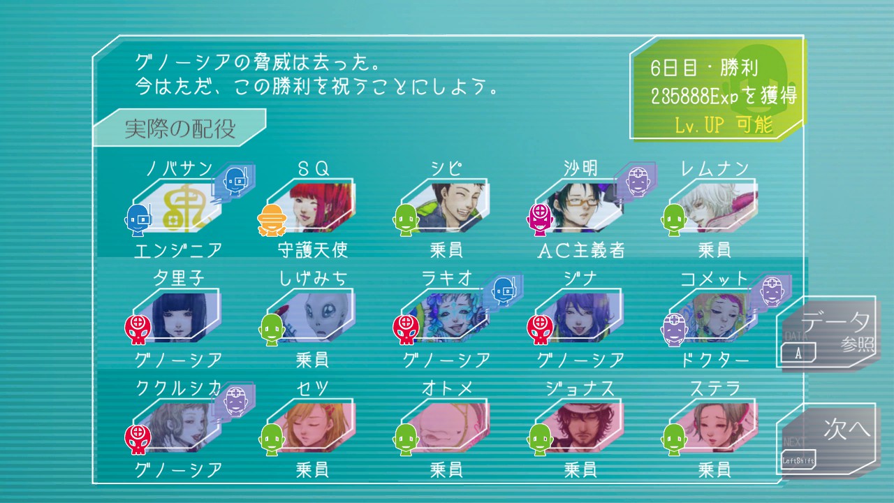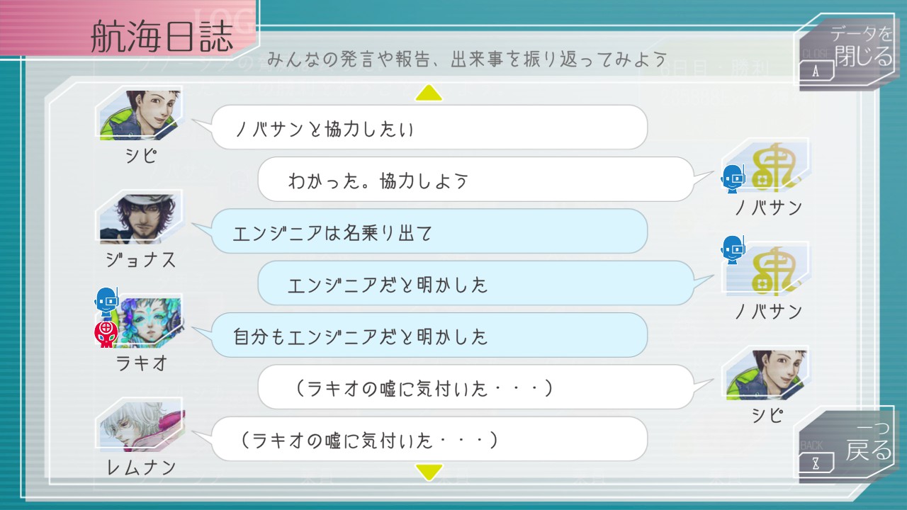 このゲームはループを重ねるごとに乗員との好感度が(プラマイ含め)蓄積していくので、プレイヤーが仲良くしようと努めた乗員は、別ループにおいても昔なじみの友人のような距離感になったりする。なあシピ…コメット…