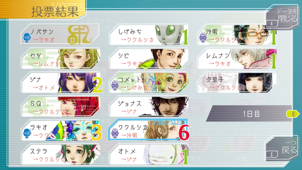 別に夕里子を疑う根拠はないのに「協力者が言ってたから」だけで投票してくれるシピ、何故かレムナンに入れるSQ、私に絶敵されたのに私に入れない沙明、そして「投票するな」をガン無視してまで沙明に入れるレムナン。カオスすぎる。これが4000ループの間に蓄積してきたものの集大成…
